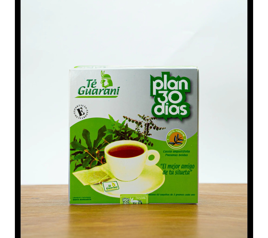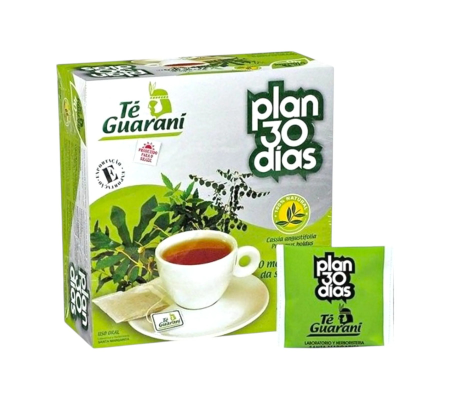 El Plan 30 días, también conocido como té guaraní, es elaborado con hierbas de reconocida acción laxante. Su suave acción laxante facilita la eliminación del ácido úrico y grasas presentes en nuestro organismo, por lo que ayuda a adelgazar de forma natural y saludable. Los resultados mejoran cuando se complementa con ejercicio físico.